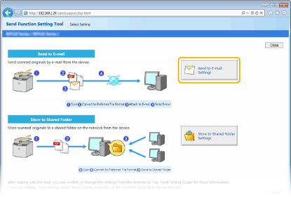 The Send Function Setting Tool helps you configure the basic settings for sending e-mails. Instead of the Send Function Setting Tool, you can use the Remote UI to configure more detailed settings such as the settings for POP authentication before sending or for encrypted communication. Configuring E-Mail/I-Fax Communication Settings