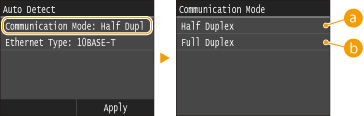 tap <Half Duplex> or <Full Duplex>.![]() <Half Duplex>Alternately sends and receives communication data. Select when the machine is connected to a networking device using half duplex.