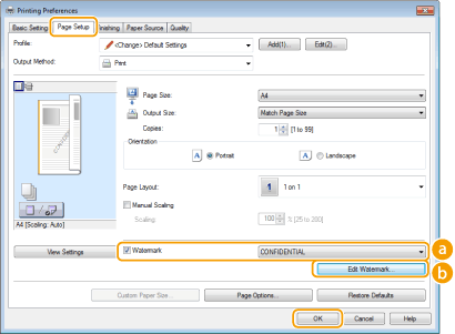 [Page Setup] tab Select the [Watermark] check box  Select a watermark from the drop-down list [OK]