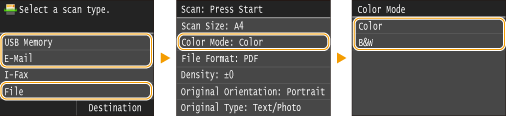 Select <USB Memory> or specify a destination with <E-Mail>/<File>