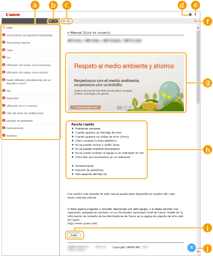 Haga clic para configurar los parámetros que determinan cómo se visualiza el e-Manual, como el diseño o el formato de caracteres.