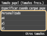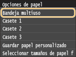 Una vez registradas las opciones de papel predeterminadas, la pantalla de configuración del papel no aparece cuando se carga papel, y se utiliza la misma configuración en todo momento. Si carga un tamaño o tipo de papel diferentes sin cambiar las opciones de papel, es posible que el equipo no imprima correctamente. Para evitar este problema, seleccione <Especificar cuando cargue papel> en el paso 3, y, a continuación, cargue el papel.