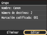 Después de registrar los destinos en un grupo, puede cambiar el contenido de la información registrada. Por ejemplo, puede cambiar el nombre del grupo o el número de marcación codificada, añadir/eliminar destinos, etc.