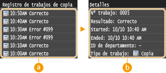 ![]() <Registro de trabajos de copia>Muestra una lista de los documentos que se han copiado. <Correcto> aparece cuando un documento se ha copiado correctamente y <Error> aparece cuando un documento no se ha copiado correctamente porque se canceló o se produjo algún error.