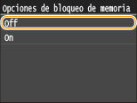 Para imprimir los documentos recibidos en la memoria, establezca <Opciones de bloqueo de memoria> en <Off>. Se imprimirán todos los documentos de la memoria.