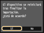 Se iniciará la importación. El equipo se reiniciará automáticamente una vez finalizada la importación.