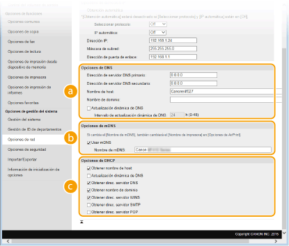 Adoptado por Bonjour, mDNS (DNS multidifusión) es un protocolo para relacionar un nombre de host con una dirección IP sin utilizar DNS. Seleccione la casilla de verificación para activar mDNS e introduzca el nombre de mDNS en el cuadro de texto [Nombre de mDNS]. [Opciones de DHCP][Obtener nombre de host]