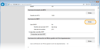Prueba de comunicación con el servidor NTP/SNTPPuede visualizar el estado de comunicación con el servidor registrado haciendo clic en [Configuración]