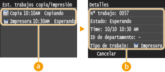 ![]() <Est. trabajos copia/impresión>Muestra la lista de documentos que se están procesando, copiando o a la espera de procesarse.