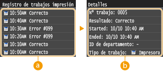 ![]() <Registro de trabajos impresión>Muestra una lista de los documentos que se han impreso.Correcto> aparece cuando un documento se imprime correctamente, y <Error> aparece cuando un documento no se imprime correctamente porque se canceló o se produjo algún error.