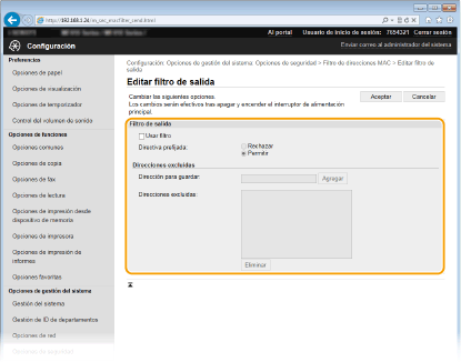 Seleccione la casilla de verificación [Usar filtro] y haga clic en el botón de opción [Rechazar] o [Permitir] en [Directiva prefijada].