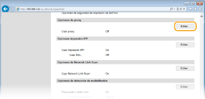 Un proxy (o servidor proxy HTTP) hace referencia a un ordenador o software que establecen comunicaciones HTTP con otros dispositivos, especialmente cuando se comunica con recursos externos a la red, como cuando se navega por sitios web. Los dispositivos cliente se conectan a la red externa a través del servidor proxy, y no se comunican directamente con los recursos externos. La configuración de un proxy no solo facilita la gestión del tráfico entre las redes internas y externas, sino que también bloquea los accesos no autorizados y consolida la protección antivirus para mejorar la seguridad. Si utiliza Google Cloud Print para imprimir a través de Internet, puede mejorar la seguridad configurando un proxy. Al configurar un proxy, asegúrese de que cuenta con la información necesaria acerca del proxy, como la dirección IP, el número de puerto y un nombre de usuario y una contraseña para la autenticación.