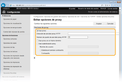 Seleccione la casilla de verificación [Usar proxy] y especifique las opciones necesarias.