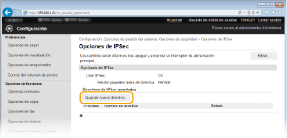 Uso del panel de controlTambién podrá activar o desactivar la comunicación IPSec desde <Menú> en la pantalla Inicio. Usar IPSec