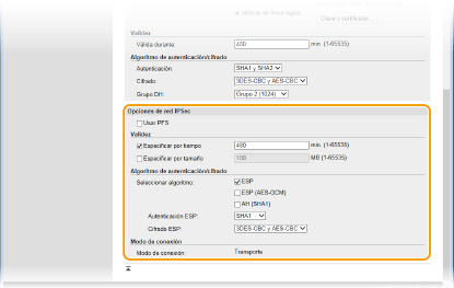 Especifique las opciones [Válida durante] y [Autenticación]/[Cifrado]/[Grupo DH].