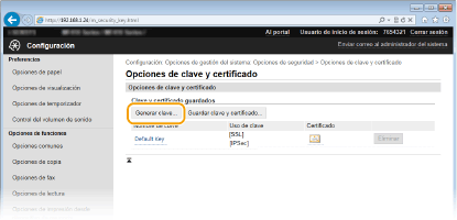 Los pares de claves no pueden eliminarse si se utilizan actualmente para algún fin, como cuando aparecen "[TLS]" o "[IEEE 802.1X]" en [Uso de clave]. En este caso, deshabilite la función o sustituya el par de claves antes de eliminarlo.