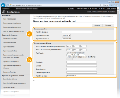 Los pares de claves pueden generarse con el equipo en caso necesario para la comunicación cifrada a través de la Seguridad de capa de transporte (Transport Layer Security, TLS). Podrá utilizar TLS para acceder al equipo a través de la IU remota. Podrán generarse hasta cinco pares de claves (incluidos los pares preinstalados) para el equipo. Los certificados autofirmados se utilizan con pares de claves generados en la "Comunicación de red". Con una "Solicitud de clave y firma de certificado (Key and Certificate Signing Request, CSR)", podrá solicitar un certificado digital emitido por la autoridad de certificación (CA) para el par de claves generado por el equipo.