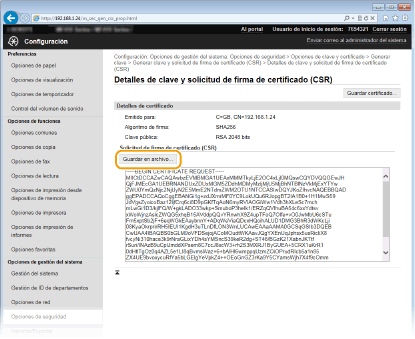 Haga clic en [Examinar], especifique el archivo para la solicitud de firma del certificado y haga clic en [Guardar].