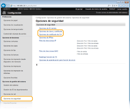[Opciones de clave y certificado] u [Opciones de certificado de CA].