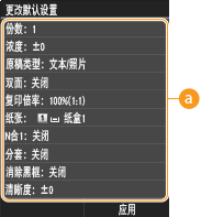 时所显示的设置即为默认设置。如果更改这些默认设置以符合您频繁执行的操作,可以省去每次复印时进行相同设置的麻烦。