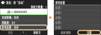 选择要删除的设置 轻触 <是>。注册设置后,无法更改接收方。要更改接收方,请删除设置,然后再次注册。