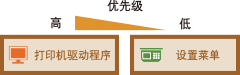 设置优先级如果从打印机驱动程序和本机的操作面板指定打印设置,则从打印机驱动程序指定优先于从操作面板指定。操作面板的指定设置在一些具体情况下生效,例如执行 PS/PCL 打印和从 UNIX 或其他不支持打印机驱动程序的操作系统打印时。
