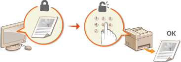 通过在从计算机打印时为文档设置 PIN,文档将保存在本机内存中,直到在本机的操作面板上输入正确的 PIN 时才会打印。此功能称为“安全打印”,由 PIN 保护的文档则称为“加密文档”。使用安全打印,可以避免机密文档处于无人处理的情况。使用此功能前,需要完成一些步骤。