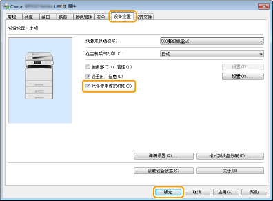 单击 [设备设置] 选项卡并且确定选择 [允许使用保密打印] 复选框。