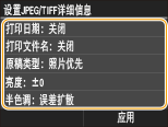 / 调整亮度,然后轻触 <应用>。<亮度> 无法用于打印未经 JPEG 压缩的 TIFF 文件。