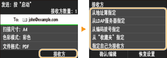 指定多个接收方时,第二个及后面的接收方必须是在地址簿或 LDAP 服务器中注册过的接收方。关于 Cc 和 Bcc,只可指定地址簿中注册过的接收方。要使用地址簿或 LDAP 服务器,必须先完成必需的注册步骤。