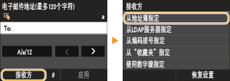 使用地址簿,可以通过从注册的接收方列表中选择来指定接收方,或可以通过含接收人姓名的接收方名称进行搜索来指定接收方。