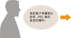 指定客户的电子邮件地址,将 <文件格式> 设置为 <JPEG> 作为扫描设置,并将地址和设置作为组合注册到 <常用设置> 中。随后可以在需要时随时轻松地使用该设置组合。注册常用的扫描设置(电子邮件/I-Fax/共享文件夹/FTP 服务器)