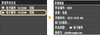 ![]() <发送作业日志>显示已发送文档的列表。文档发送成功时会显示 <完成>,文档发送因取消或出现错误而失败时会显示 <错误>。