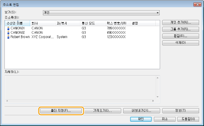 자주 사용하는 수신인을 PC 팩스용 주소록에 등록하면 PC 팩스를 송신할 때마다 수신인을 쉽게 지정할 수 있습니다. 또한 Microsoft Excel과 같은 응용 프로그램에서 작성한 CSV 형식의 주소록 데이터를 기기로 가져오거나 다른 팩스기나 응용 프로그램에서 사용하도록 파일을 내보낼 수 있습니다.