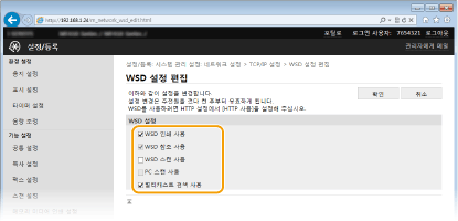 WSD를 통해 컴퓨터에서 기기에 대한 정보를 얻으려면 확인란을 선택합니다. 이 확인란은 [WSD 인쇄 사용] 확인란이 선택된 경우 자동으로 선택됩니다. [WSD 스캔 사용]