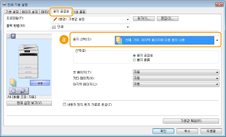 첫째 페이지, 본문 페이지 및 마지막 페이지에 다른 용지를 사용할 수 있습니다. 예를 들면, [첫 페이지]에 다목적 트레이에 적재된 용지를 지정할 수 있으며, [기타 페이지](본문 페이지)에는 카세트에 적재된 용지를, [마지막 페이지]에는 다목적 트레이에 적재된 용지를 지정할 수 있습니다. 또한, [선택]에서 [용지 종류]를 선택하여 용지 공급원 대신 인쇄에 사용할 용지 유형을 지정할 수 있습니다.