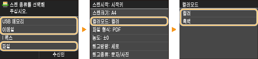 <USB 메모리>를 선택하거나 <이메일>/<파일>로 수신인 지정