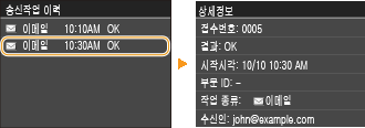 ![]() <송신작업 이력>전송한 문서의 목록을 표시합니다. 문서가 성공적으로 전송된 경우 <OK>가 표시되고, 취소되거나 에러가 발생하여 문서를 전송하지 못한 경우에는 <에러>가 표시됩니다.