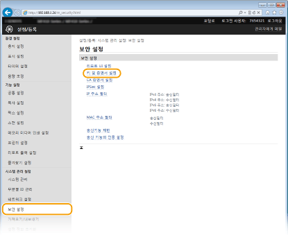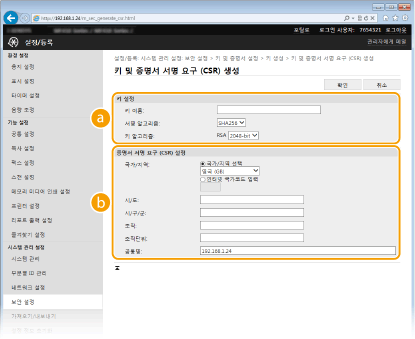TLS(Transport Layer Security)을 통한 암호화된 통신에 필요한 경우 기기에서 키 쌍을 생성할 수 있습니다. 리모트 UI를 통해 기기에 액세스할 때 TLS를 사용할 수 있습니다. 최대 5개의 키 쌍(사전 설치된 키 쌍 포함)을 기기에 생성할 수 있습니다. 자필 서명한 인증서가 "네트워크 통신"에서 생성된 키 쌍과 함께 사용됩니다. "키 및 인증서 서명 요구(CSR)"로 기기에 의해 생성된 키 쌍에 대한 CA 발행 디지털 인증서를 요청할 수 있습니다.