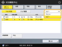 コピーの基本画面で操作パネルの(ストップ)を押すとコピーが一時中断され、<<ストップ>中止するコピージョブを選択します。>というメッセージとコピーの一覧が表示されます。この画面でコピーを選び、<中止>を押してコピーを中止することもできます。