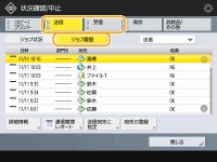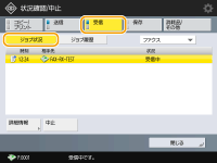 文書を選んで<中止>を押すと、受信を中止することができます。複数のジョブを選択して中止することはできません。1 つずつ選択して中止してください。