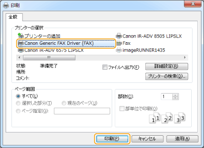 [セキュリティー設定]ダイアログボックスで[宛先の設定時にファクス番号/URIを確認入力する]が設定されている場合、指定したファクス番号を[ファクス番号の確認入力]テキストボックスに再度入力します。詳しくは、ファクスドライバーのヘルプを参照してください。