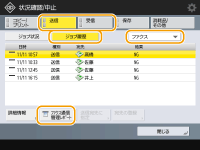 (状況確認/中止)を押して表示される状況確認画面から、コピー、プリント、Eメール送信、ファクス送受信、Iファクス送受信、保存スペース「アドバンスドボックス」への保存などの使用履歴を確認することができます。この使用履歴から、リストをプリントすることができます。