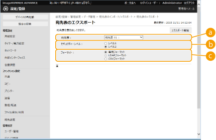 3 | 必要な設定をする ![]() [宛先表]エクスポートする宛先表を選びます。なお、保存後の宛先表名はお買い上げ時の名称に戻ります。 [セキュリティーレベル][フォーマット]で[専用フォーマット]を選んだときにセキュリティーレベルを設定できます。[レベル1]を選ぶと、すべてのキヤノン複合機にインポートできます。[レベル2]を選ぶと、宛先表データのパスワードを[レベル1]より安全な方式で暗号化します。ただし、インポート先が[レベル2]の設定に対応した機種(本設定で[セキュリティーレベル]の項目が表示される機種)のみに制限されます。 [フォーマット]エクスポートするデータのファイル形式を選びます。宛先表に登録されているすべての情報を他のキヤノン複合機でインポートする場合は[専用フォーマット]を、パソコンのアプリケーションで利用する場合は[LDAPフォーマット]または[CSVフォーマット]を選びます。なお、[LDAPフォーマット]で保存されるのはEメールアドレスとファクス番号のみです。 ![]() エクスポートするデータにパスワードを設定するには <アドレス帳エクスポートの対象にパスワードを含める>を<ON>に設定します(<アドレス帳エクスポートの対象にパスワードを含める>)。この設定を行うと、[宛先表のエクスポート]画面にパスワードを入力する項目が表示されます。パスワードを設定したデータは、正しいパスワードを入力しないとインポートできなくなります。 CSVフォーマットでエクスポートしたデータを編集するには アドレス帳の各カラムについてはアドレス帳の各項目についてを参照してください。 古いバージョンの本体にインポートする場合には、正しくインポートできない場合があります。 |