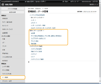 1 | [個別インポート/エクスポート]の[デバイス設定(転送設定、アドレス帳、送信のよく使う設定)]をクリックする |