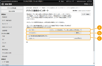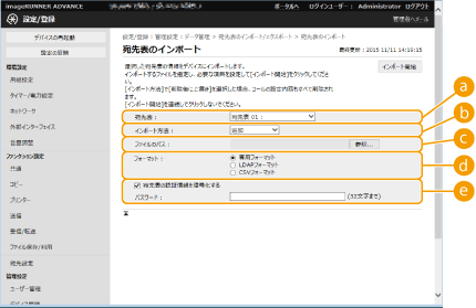 3 | 必要な設定をする ![]() 現在のアドレス帳は削除され、インポートするアドレス帳に上書きされます。 インポートを実行すると、本機を再起動するまでリモートUIからの操作はできません。また、設定内容は再起動後に有効になります。電源を切る/再起動する ![]() [フォーマット]インポートする設定データのファイル形式を選びます。ファイル形式はエクスポートした複合機の機種によって異なりますので、インポートするファイルを確認してください。 [ファイルのパス][参照...]をクリックし、インポートするファイルを指定します。 [宛先表の認証情報を復号化する]暗号化されたファイルをインポートする場合はチェックマークを付け、設定データをエクスポートした際に入力したパスワードを入力します。 |