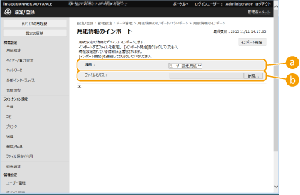 3 | 必要な設定をする ![]() [種別]用紙の設定情報を選びます。 [ファイルのパス][参照...]をクリックし、インポートするファイルを指定します。 |