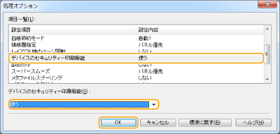 [デバイスのセキュリティー印刷機能]で[使う]を選び、[OK]をクリックする