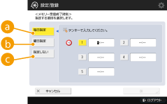 <共通設定> <エラージョブクリア>が<OFF>に設定されている場合は、転送エラー文書は<状況確認/中止>画面の<ジョブ状況>に保存され、ここで設定する処理は行われません。<保存/プリント>選択時にメモリー受信を設定している場合は、保存します。 <保存/プリント>選択時にメモリー受信を設定していない場合は、プリントします。 |