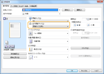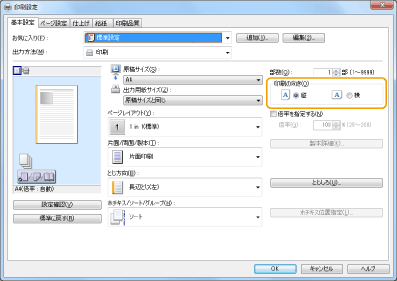 2 | ドライバーの[基本設定]画面で、手順1と同じ向きに[印刷の向き]を設定する ![]() |